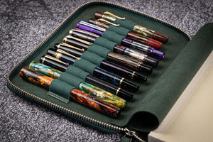10'lu Fermuarlı Deri Kalemlik ve A5 defter kılıfı bu üründe bir araya geliyor. İçindeki kadife dokunuşlu koruyucu kumaş kalemlerinizi çizilmelere karşı korurken, A5 defter gözü de, hem 10 favori kaleminizi hem de A5 boy defterinizi birlikte taşımanıza imkan sağlıyor. Eğer yanınızda hem kalemleriniz, hem defteriniz bir arada olsun istiyorsanız, bu kalemlik tam size göre.