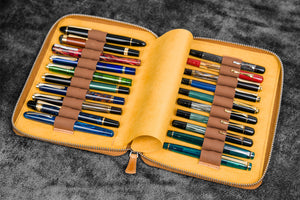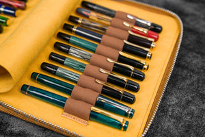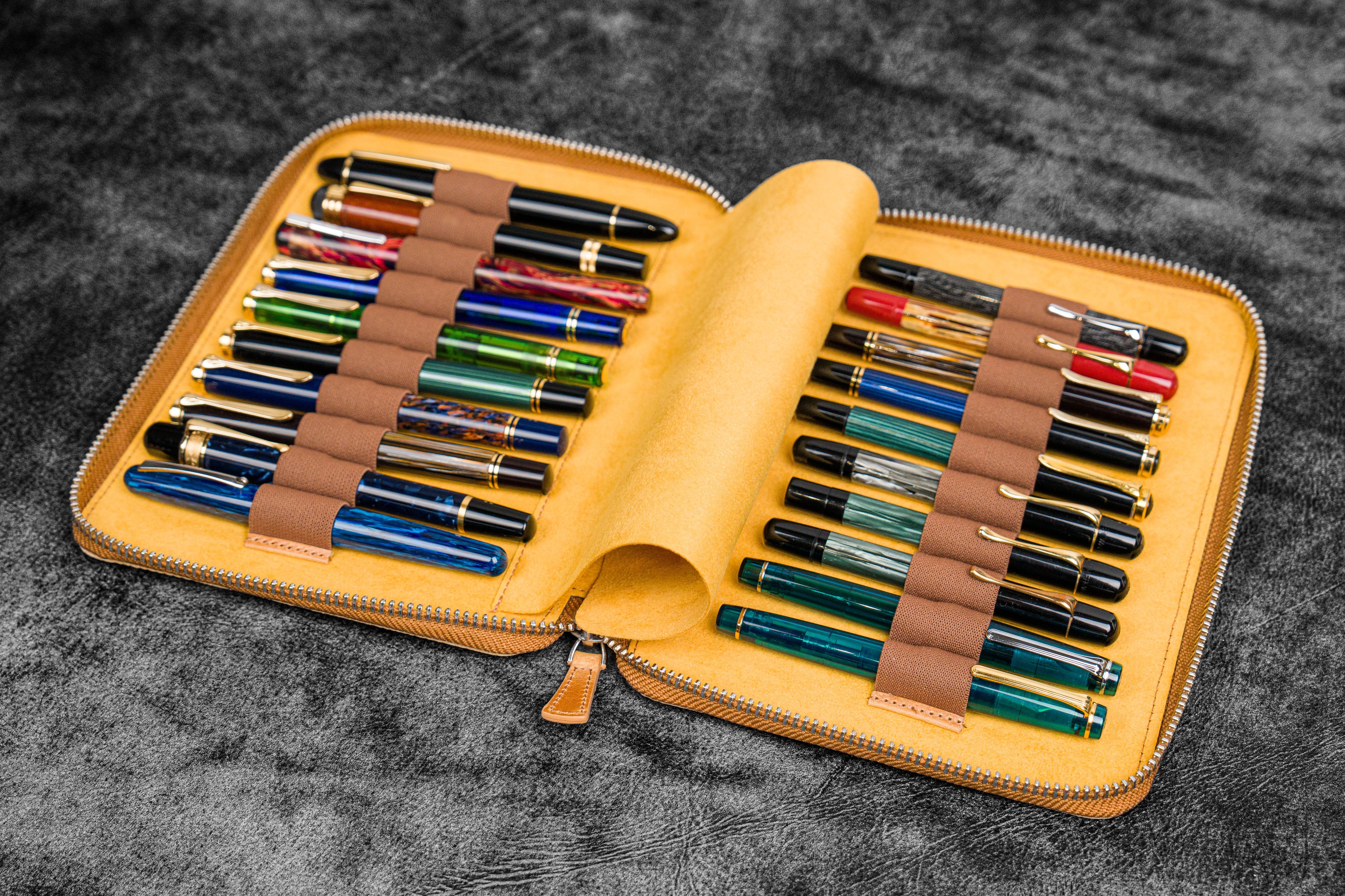 20 kalem kapasitesine sahip, fermuarlı ve el yapmı bu deri kalemlik, içindeki kadife Dokunuşlu koruyucu kumaşı ile kalemlerinizi çizilmeksizin yanınızda taşımanıza imkan tanır. En sevdiğiniz 20 kaleminizi yanınızda taşırken, kalemlerinizin çizilmesinden ya da mürekkep akması gibi kazalardan endişe etmenize gerek kalmaz.