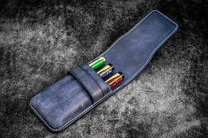 Eskiltilmiş koyu mavi deri, mavinin açıklı koyulu farklı tonlarını taşır. Crazy Horse, oldukça yumuşak ve az işlemden geçmiş bir deri türüdür. Bu nedenle deri üzerinde zamanla ve kullanıma bağlı olarak çizikler meydana gelebilir. Bu duruma patina adı verilir ve bazı deri severler için oldukça aranılan bir özelliktir. Eğer bu kullanım izlerinin sizi mutsuz edeceğini düşünüyorsanız, defterlerde karton kapaklı olanlara, kalemlik gibi deri ürünlerde ise cilalı derilere bakmanızı tavsiye ederiz.14 santimetre uzunluğa ve 1.5 santimetre gövde genişliğine kadar olan kalemlerle uyumludur.