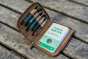 5'li Fermuarlı Deri Kalemliğimiz, yanınızda 5 adet dolmakaleminizi ve bir adet A6 boy defterinizi taşımanıza olanak tanır. Kalemliğin içindeki kadife dokunuşlu kumaş, kalemlerinizin çizilmesini engellerken, yanındaki defter bölmesiyle de notlarınızı hızlı bir şekilde almanıza yardımcı olur.