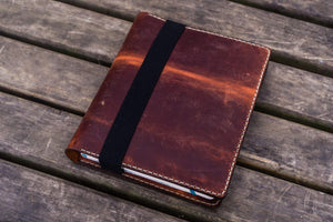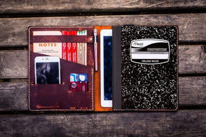 Save yourself the hassle of digging around your bag by keeping your valuables safe and secure in one place. Our Handmade Leather Composition Notebook and iPad Air/Pro (9.7) Cover is the perfect way to store your everyday essentials for work, study or personal use. It has 3 main pockets; one phone pocket and two card holders. On the left side you can put your Field Notes notebook, passport or mobile phone (no wonder it makes a great refillable leather journal!) Under the pockets on both sides there are sleeves for storing your iPad device. An elastic band holds the notebook in place inside on the right side and wraps around the left side of the cover to keep the case securely closed.