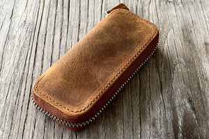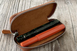 Our Purple Leather Zippered Double Pen Case was specially created for fellow fountain pen lovers. Handmade from genuine leather, this double zippered pen case allows you to safely store your fountain pen or similar sized Kaweco pocket pen to protect it from scratches or leaking in your pocket or bag. Can store 2-3 Kaweco pens or similar sized fountain pens.