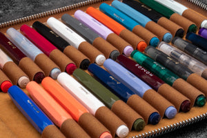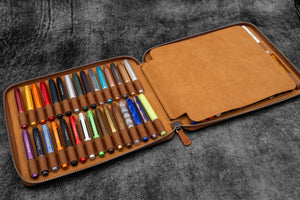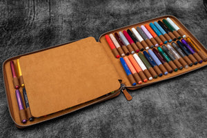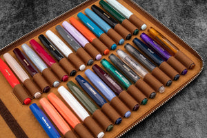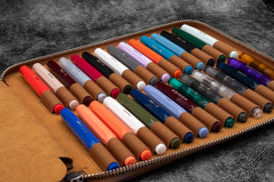 This Leather Zippered Pen Case has a velvet lined interior and holds up to 60 pocket size pens. This full-grain leather pen holder is great to protect your fountain pens and keeping them safe. For long lasting wear, use our leather balm to condition your pen case.