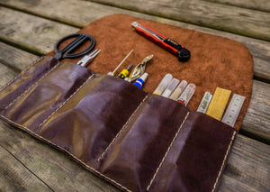 This roll up Leather Pen and Tool Case is the perfect way to store and transport your pens, pencils and other accessories with style and class. Whether you're a craftsperson, painter, makeup artist, carpenter, handyman/woman, or simply need a practical way to carry your stationary items around, this leather tool roll will do the job perfectly. You can close it tightly with an adjustable leather strap so it fits neatly in the palm of your hand.