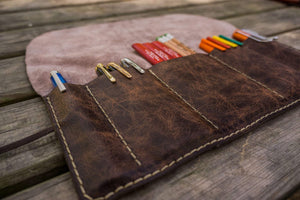 Bu rulo tasarımlı Deri Kalem ve Alet Çantası, kalemlerinizi, kurşun kalemlerinizi ve diğer aksesuarlarınızı şık ve güvenli bir şekilde saklamak ve taşımak için mükemmel bir çözümdür. İster zanaatkâr, ressam, makyaj sanatçısı, marangoz, tamirci ya da günlük hayatında kırtasiye ürünlerini pratik şekilde yanında taşımak isteyen biri olun; bu deri alet rulosu işini kusursuz şekilde görür. Ayarlanabilir deri kayışı sayesinde sıkıca sarılarak kapanır ve avucunuzun içine rahatça sığacak kadar kompakt hale gelir.