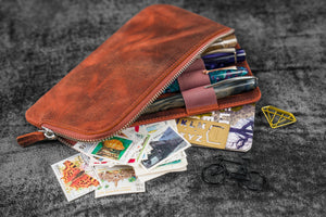 This Leather Zippered Pen Pouch in crazy horse brown has an unlined interior and holds up to 4 pens with a removable pen insert.