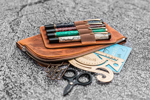 Deri "Slip-N-Zip" 4'lü Fermuarlı Kalem Kılıfı - Crazy Horse Taba