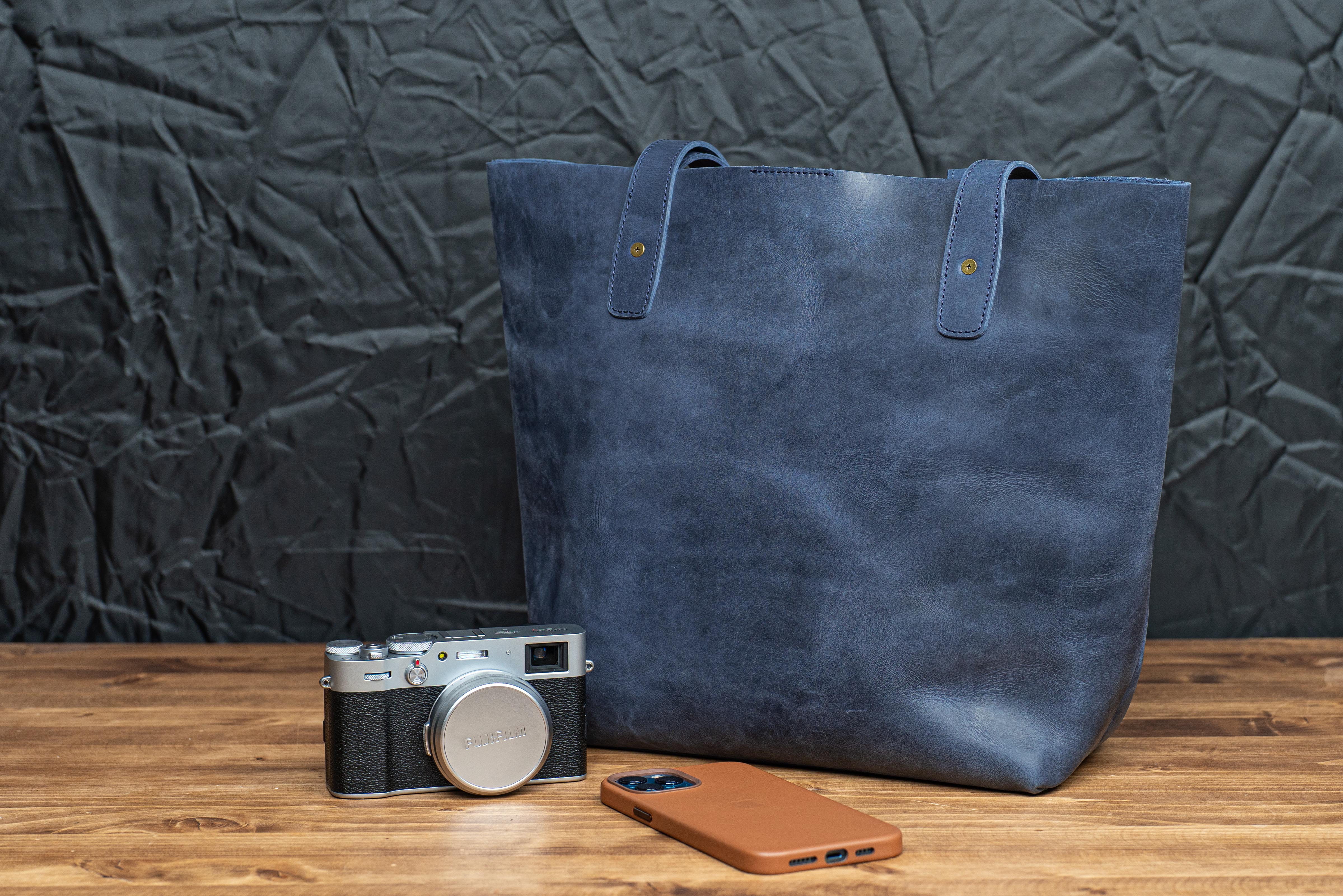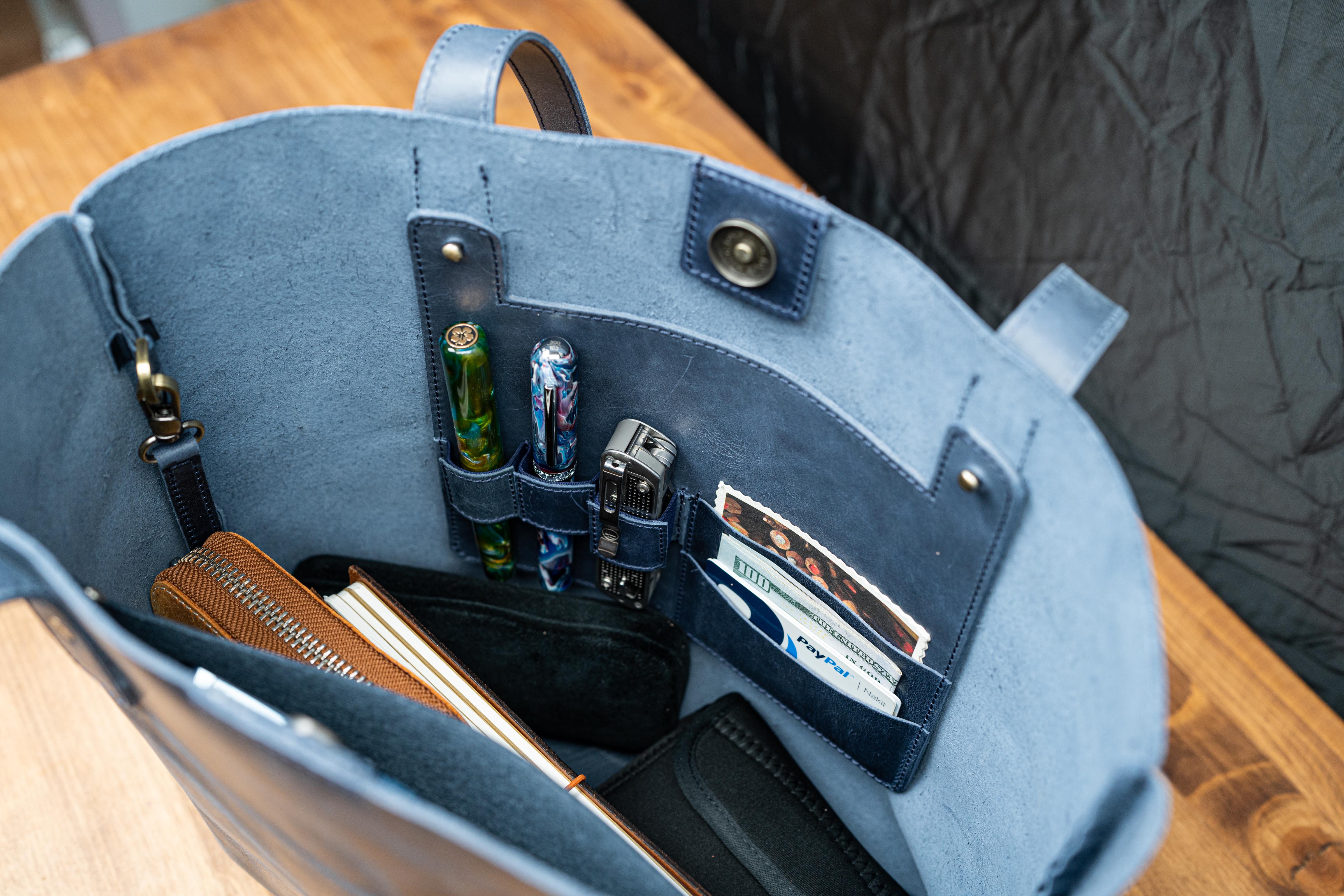 El Yapımı Lacivert Deri Tote Çanta, çantasına hayatını sığdırmayı sevenler için ideal boyuttadır! Günlük kullanım için yeterince kompakt ama ekstra eşyalarınızı da taşıyacak kadar geniştir. 13” MacBook, su şişesi, makyaj çantası ve hatta bir kazak rahatlıkla sığar.