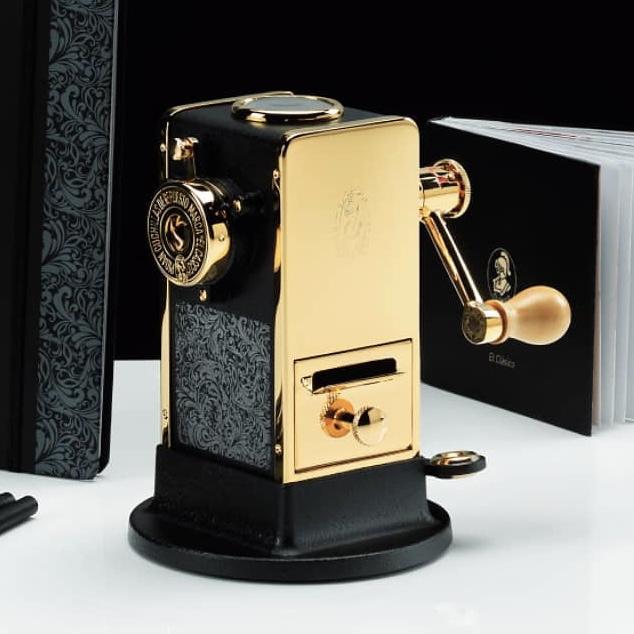 Hand crank pencil sharpener in black and 23kt gold finish.