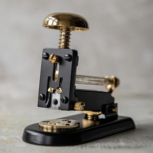 Hand polished desk stapler with 23k gold plated and black lacquered body. It is manufactured in steel and zamak. The design was developed in 1932.