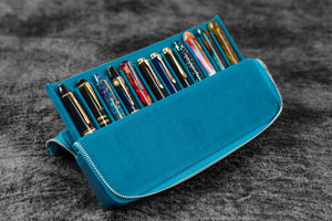 Transport your favorite pens safely without them getting damaged or scratched with our Handmade Black Leather Zippered Magnum Opus 12 Slots Pen Case. This sturdy case features a removable tray that slides in and out effortlessly, providing you easy access to your pens. The removable tray also includes 12 individual pen slots lined with soft velvet material to prevent scratches. Whether you're carrying your pens in your in bag or luggage, you'll have the peace of mind knowing that your pens are well protected from bumps, knocks, scratches and damage with this leather case. Suitable for most fountain pens and other type of pens.