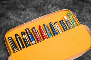 Transport your favorite pens safely without them getting damaged or scratched with our Handmade Crazy Horse Honey Ochre Leather Zippered Magnum Opus 12 Slots Pen Case. This sturdy case features a removable tray that slides in and out effortlessly, providing you easy access to your pens. The removable tray also includes 3 individual pen slots lined with soft velvet material to prevent scratches. Whether you're carrying your pens in your in bag or luggage, you'll have the peace of mind knowing that your pens are well protected from bumps, knocks, scratches and damage with this leather case. Suitable for most fountain pens and other type of pens.