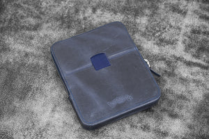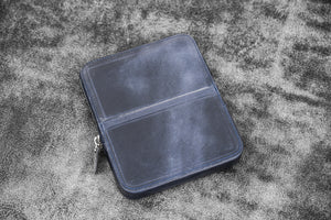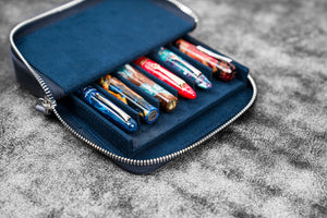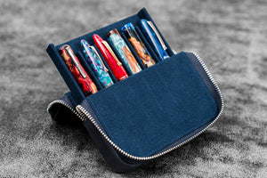 Transport your favorite pens safely without them getting damaged or scratched with our Handmade Crazy Horse Navy Blue Leather Zippered Magnum Opus 6 Slots Pen Case. This sturdy case features a removable tray that slides in and out effortlessly, providing you easy access to your pens. The removable tray also includes 3 individual pen slots lined with soft velvet material to prevent scratches. Whether you're carrying your pens in your in bag or luggage, you'll have the peace of mind knowing that your pens are well protected from bumps, knocks, scratches and damage with this leather case. Suitable for most fountain pens and other type of pens.