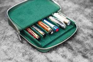 Transport your favorite pens safely without them getting damaged or scratched with our Handmade Crazy Horse Forest Green Leather Zippered Magnum Opus 6 Slots Pen Case. This sturdy case features a removable tray that slides in and out effortlessly, providing you easy access to your pens. The removable tray also includes 3 individual pen slots lined with soft velvet material to prevent scratches. Whether you're carrying your pens in your in bag or luggage, you'll have the peace of mind knowing that your pens are well protected from bumps, knocks, scratches and damage with this leather case. Suitable for most fountain pens and other type of pens.