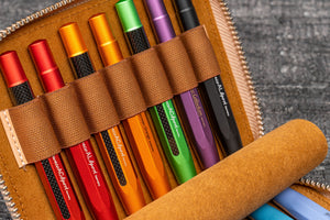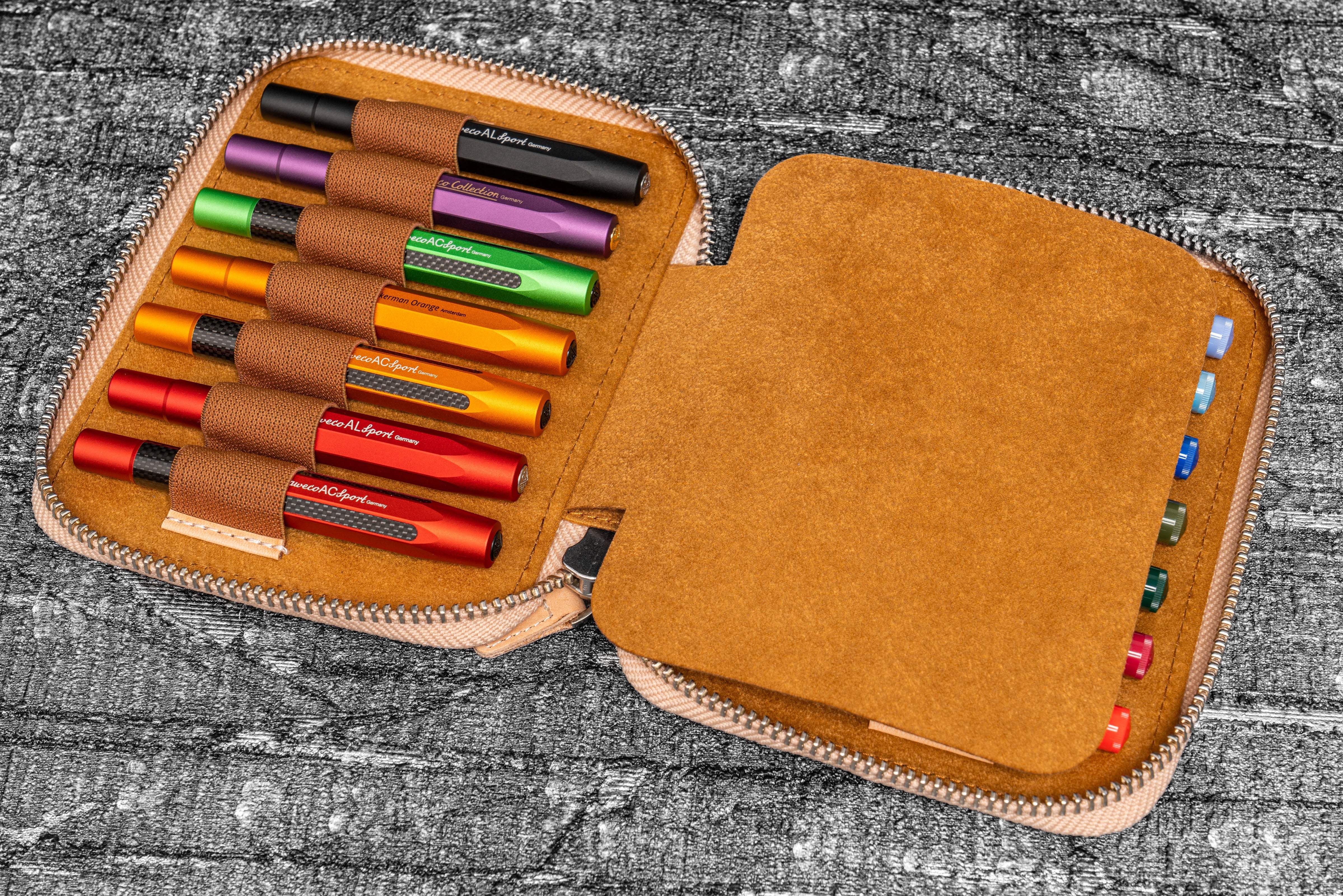Kaweco koleksiyonerlerine müjde! Renk renk Kaweco'larınızı yan yana taşımak ve sergilemek için harika bir kalemliğimiz var. Crazy Horse isimli özel bir deri çeşidinden yapılan bu fermuarlı kalemliğimiz 14 tane cep boy kalem alabiliyor. Böylelikle, en sevdiğiniz kalemlerinizi çantanızda ya da yanınızda güvenle taşıyabilir ve gururla sergileyebilirsiniz.