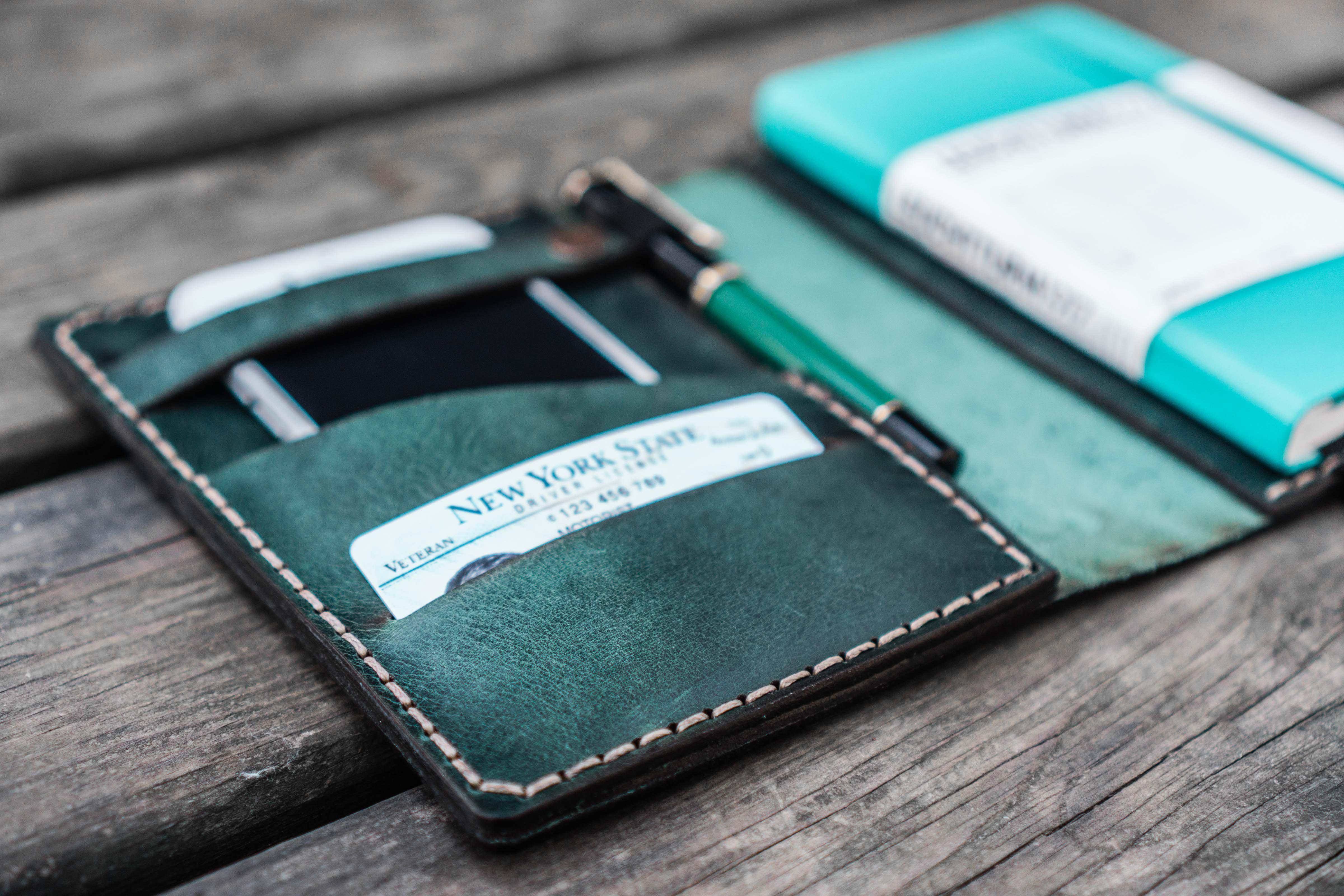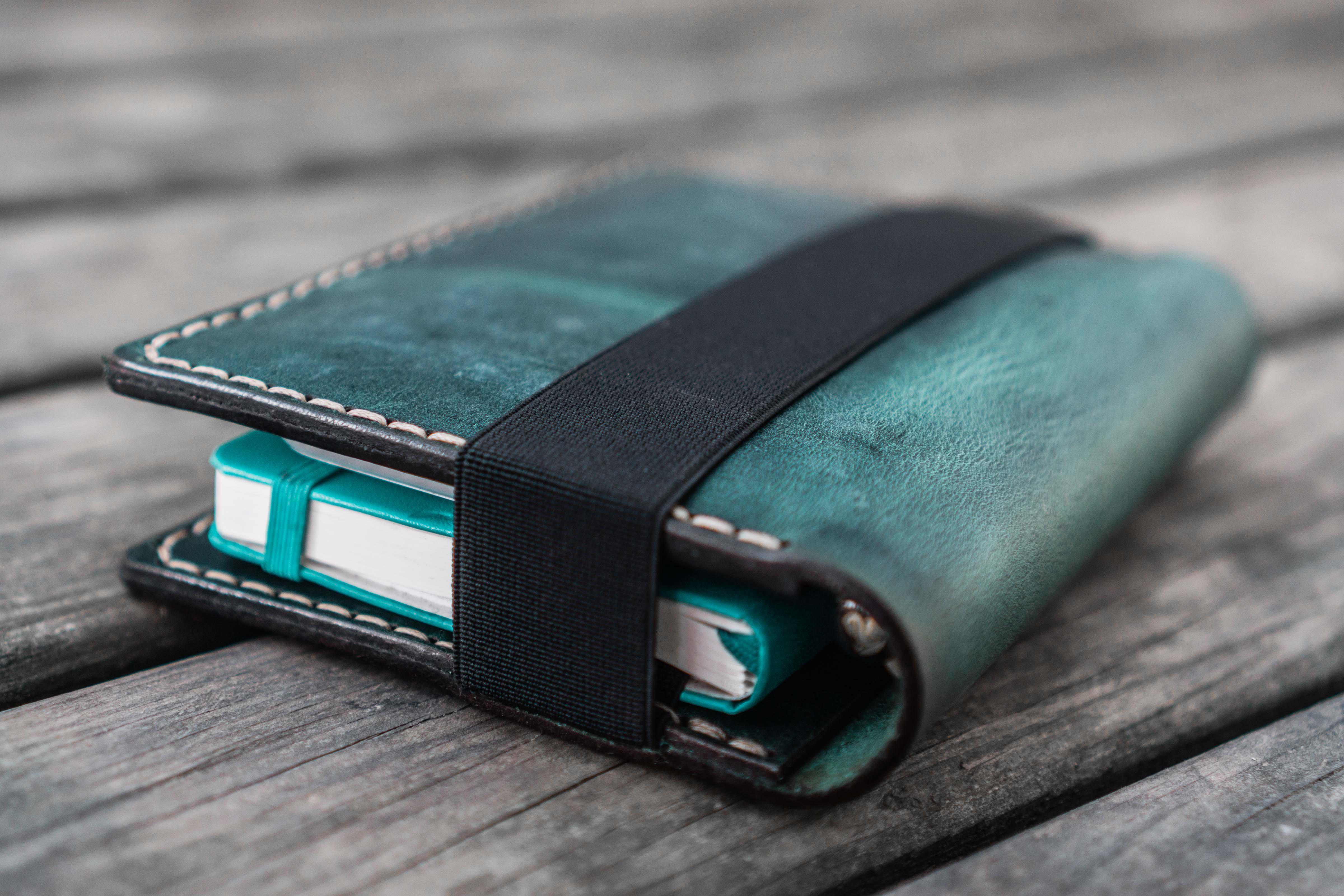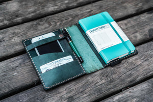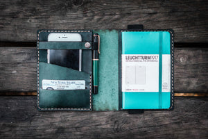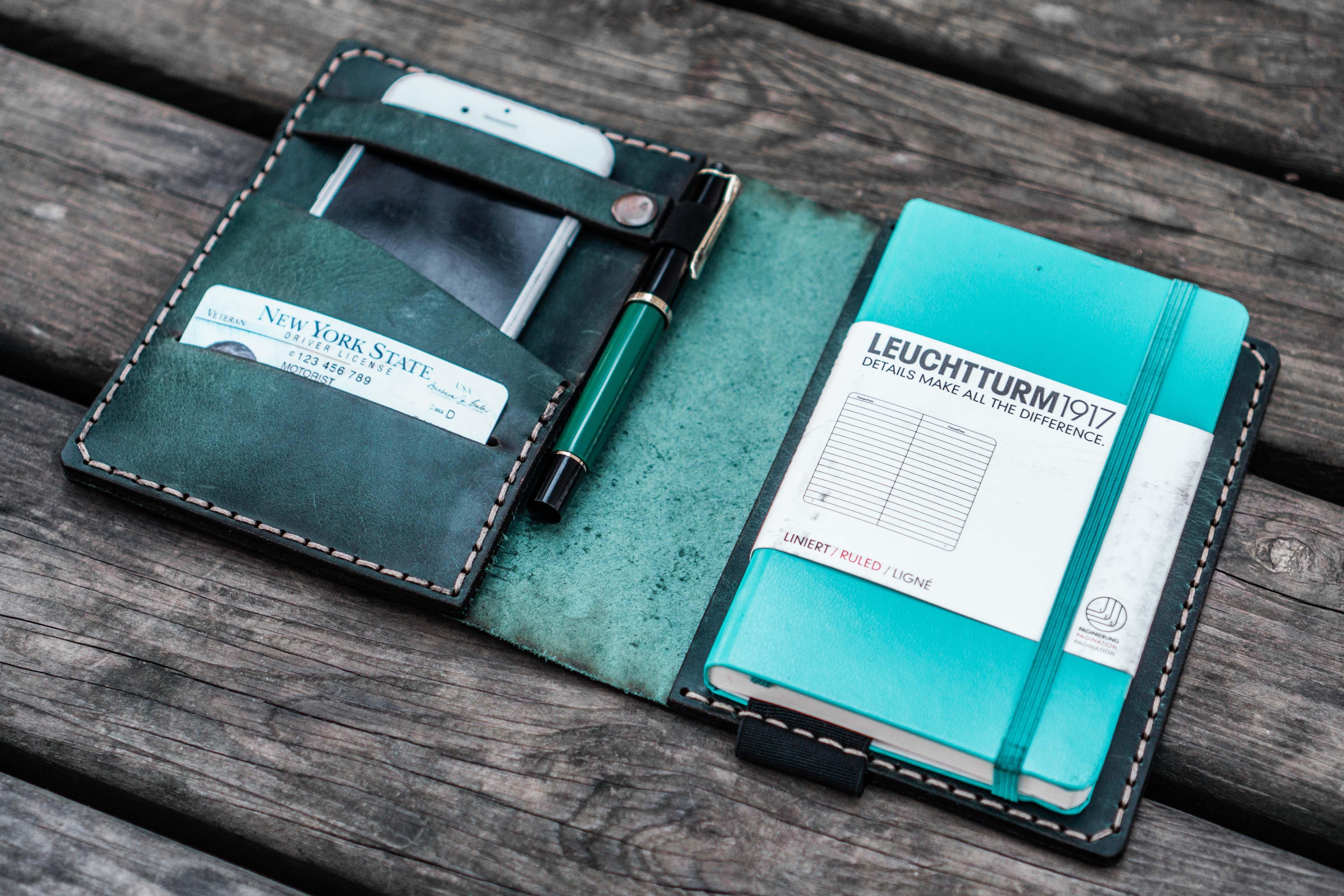 Save yourself the hassle of digging around your bag by keeping your valuables safe and secure in one place. Our Handmade Leather Leuchtturm1917 A6 Notebook Cover is the perfect way to store your everyday essentials for work, study or personal use. It has 3 main pockets and a card holder. On the left side you can store a small notebook, passport or mobile phone. If you would like to use a thick pen with this journal, the leather pen holder holds up to a Lamy Safari fountain pen size.An elastic band holds the notebook in place inside on the right side and wraps around the left side of the cover to keep the case securely closed.