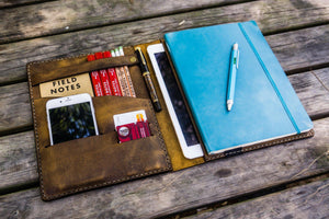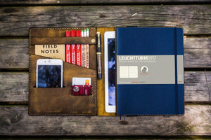 Save yourself the hassle of digging around your bag by keeping your valuables safe and secure in one place. Our Handmade Leather Leuchtturm1917 B5 Notebook and iPad Air/Pro Cover is the perfect way to store your everyday essentials for work, study or personal use. It has 3 main pockets; one main phone pocket and two card holders. On the left side you can store a small notebook, passport or mobile phone. Underneath with side is a slot to store yoru iPad device. An elastic band holds the notebook in place inside on the right side and wraps around the left side of the cover to keep the case securely closed.