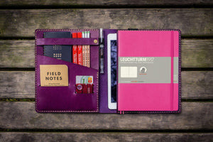 Save yourself the hassle of digging around your bag by keeping your valuables safe and secure in one place. Our Handmade Leather Leuchtturm1917 B5 Notebook and iPad Air/Pro Cover is the perfect way to store your everyday essentials for work, study or personal use. It has 3 main pockets; one main phone pocket and two card holders. On the left side you can store a small notebook, passport or mobile phone. Underneath with side is a slot to store yoru iPad device. An elastic band holds the notebook in place inside on the right side and wraps around the left side of the cover to keep the case securely closed.