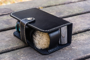 This vintage-inspired Handmade Leather Travel Kitis designed to keep your favorite razor, brush and blades comfortably secure whether at home or for when you're traveling. The open design allows ventilation for the brush after a wet shave. Other features include an elastic razor loop. The case is made from our signature vegetable tanned leather which will patina beautifully and mould to the shape of the razor stem.