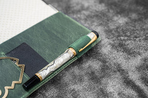 Made from the finest quality leather, our Handmade Crazy Horse Forest Green Leather Slim A5 Notebook / Planner Cover is bound to be a timeless addition your writing practices. The slim cover is designed to fit an A5 notebook or planner and flips open effortlessly for ease of use. The cover also has 1 slot for your pen, as well as one slip pocket on the inside for other small accessories.