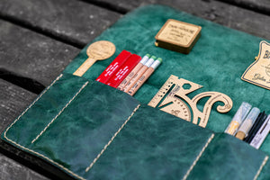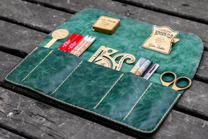 This roll up Leather Pen and Tool Case is the perfect way to store and transport your pens, pencils and other accessories with style and class. Whether you're a craftsperson, painter, makeup artist, carpenter, handyman/woman, or simply need a practical way to carry your stationary items around, this leather tool roll will do the job perfectly. You can close it tightly with an adjustable leather strap so it fits neatly in the palm of your hand.
