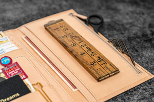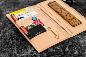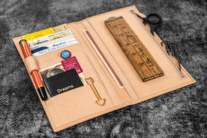 This leather long travel wallet can be seamlessly incorporated into your regular size Traveler's Notebook or used as a stand-alone wallet.