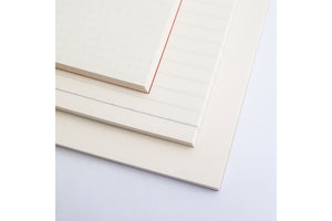 The smooth cream-colored pages come in three types, and are color-coded by their cover: plain (brown), ruled (light blue) and gridded (orange). Feathering and bleed-through free paper is fit for writing instruments of any type, including fountain pens. The stitch binding allows for the book to lay flat when opened.