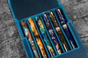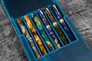 Transport your favorite pens safely without them getting damaged or scratched with our Handmade Crazy Horse Brown Leather Magnum Opus 6 Slots Hard Pen Case. This sturdy case features a removable tray that slides in and out effortlessly, providing you easy access to your pens. The removable tray also includes 6 individual pen slots lined with soft velvet material to prevent scratches. Whether you're carrying your pens in your in bag or luggage, you'll have the peace of mind knowing that your pens are well protected from bumps, knocks, scratches and damage with this leather case. Suitable for most fountain pens and other type of pens.