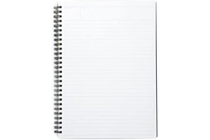 Japonya'da üretilen bu A5 boyutlu defter, 80 yaprak beyaz asitsiz 80gsm çizgili kağıda sahiptir. Siyah çift telli yan spiral ciltleme, siyah plastik kapağa uyumludur.