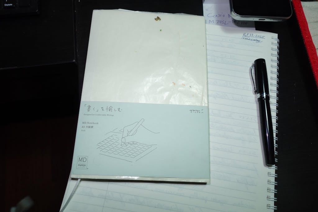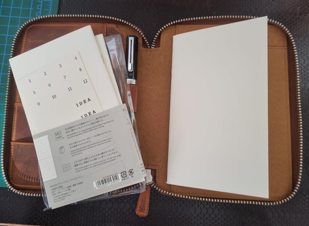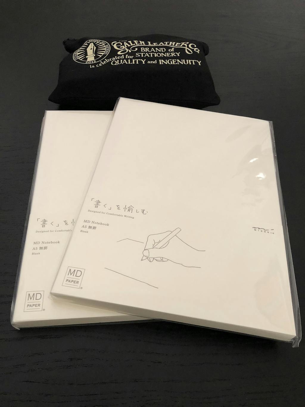 MD Notebook by Midori, a Japanese company that specializes in paper since 1960. Other than the small embossing of MD Paper, the notebook is simplistic and perhaps plain. Midori wants to emphasize the quality of the paper and your writing experience. The pen glides on the paper, and the paper does not bleed, ghost and feather. The touch and feel of the texture of the paper and the cover cannot convey through picture. We encourage you to come try them out in person with us