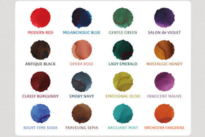 The Guitar Tasho Roman Haikara line of fountain pen ink from Teranishi reflects a time of high fashion and elegance from the Taisho era in Japan. In fact, haikara or 'high collar' became popularized as a term to describe 'stylish, new, fresh or fashionable' trends and culture that began entering Japan from Europe and America between 1912 and 1926. These vibrant inks were developed to reflect this era in history.