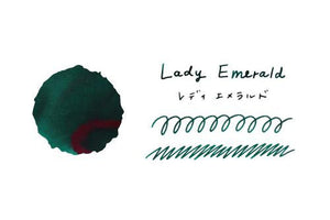 Teranishi Guitar Taisho Roman Haikara Fountain Pen Ink - Lady Emerald. Lady Emerald displays a deep, blue-green hue that sheens beautifully red violet. Emerald was and is regarded as a highly sophisticated color, often associated with the Art Deco era.