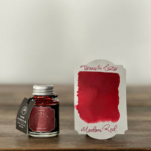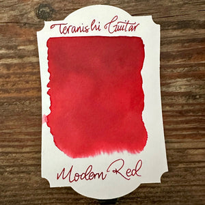 Teranishi Guitar Taisho Roman Haikara Fountain Pen Ink - Modern Red. Modern Red is a bright red that reminds us of red wine and popular lipstick shades of the Taisho era. The import of red wine to Japan became popular starting in the early 1900s, as did the use of lipstick as a representation of female empowerment.
