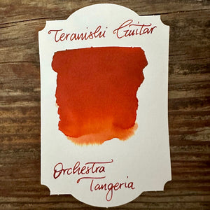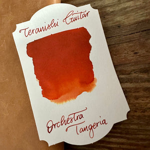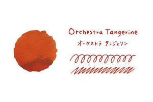 Teranishi Guitar Taisho Roman Haikara Fountain Pen Ink - Orchestra Tangerine. Orchestra Tangerine is the color of a crimson bitter orange. It conjures up the joyous feeling you get after hearing a sublime melody play.