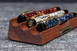 El işçiliğiyle üretilen kalemlik ile çalışma masanızı güzelleştirin. Şık ve profesyonel bir tasarıma sahip olan bu kalemlik, kalem koleksiyonerleri, dolmakalem kullanıcıları , ofis çalışanları veya sanatçılar için harika bir hediye seçeneğidir. 'The Pen Rest', masif maun ağacından yapılmıştır ve üç kalem yuvası bulunur. Dolma kalemler dahil çoğu kalem ve fırça türünü tutabilir ve çalışma masanızda deri masa altlıklarımızın yanında çok şık durur.