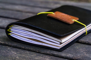 This gorgeousHandmade Black Leather Notebook Cover is aperfectly stylish way to store your travel journal or notebooks for recording all your precious memories and travel tales. Made from well-aged leather, it has four standard elastic bands to secure 4-6 notebooks (depending on size). This black leather notebook cover is timeless, stylish, and sleek.