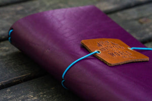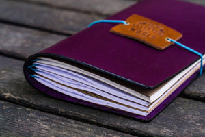 This gorgeousPurple Leather Traveler's Notebook Cover is aperfectly stylish way to store your travel journal or notebooks for recording all your precious memories and travel tales. Made from well-aged leather, it has four standard elastic bands to secure 4-6 notebooks (depending on size).